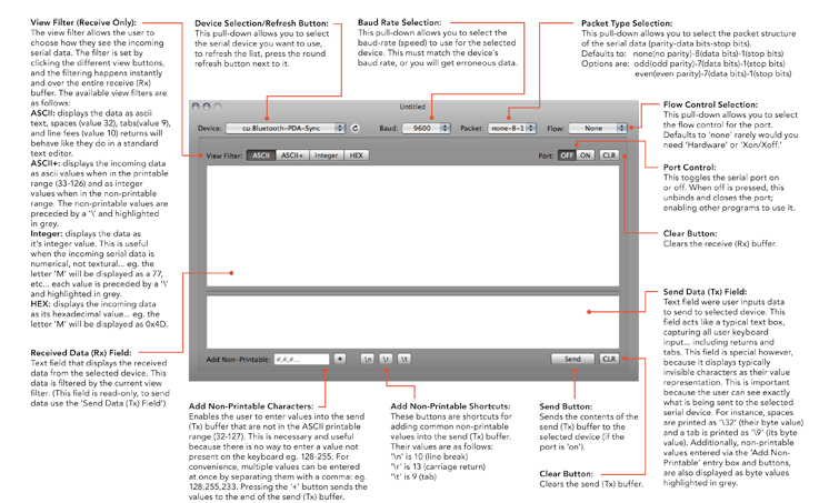 • Quick device listing • Ability to send non-printable byte values • Selectable baud rate/packet structures |